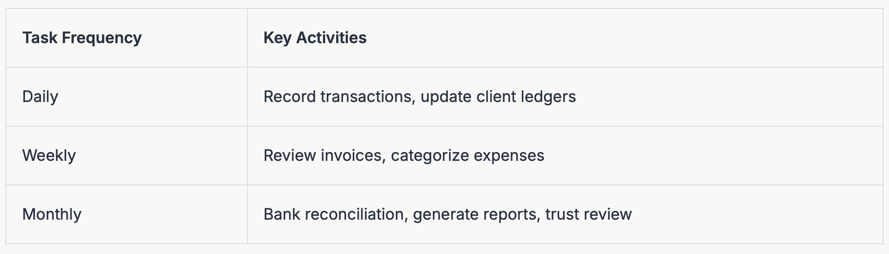 Weekly, review outstanding invoices and update billing records. Each month, perform a full bank reconciliation, generate financial reports, and review trust account balances. Use a checklist or table to ensure no steps are missed. Routine diligence helps catch errors early and keeps your firm financially organized.