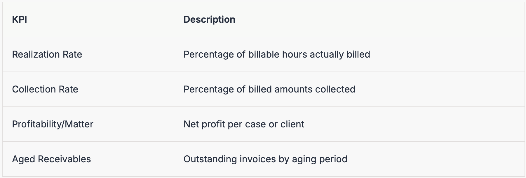 Tracking performance metrics is a core aspect of accounting for attorneys. Focus on a few key indicators to gauge your firm’s financial health:
