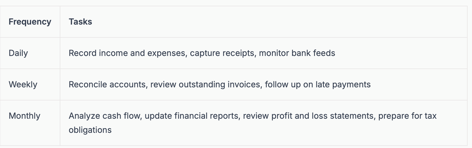For a detailed breakdown of these essential responsibilities, see Bookkeeping tasks every business needs.