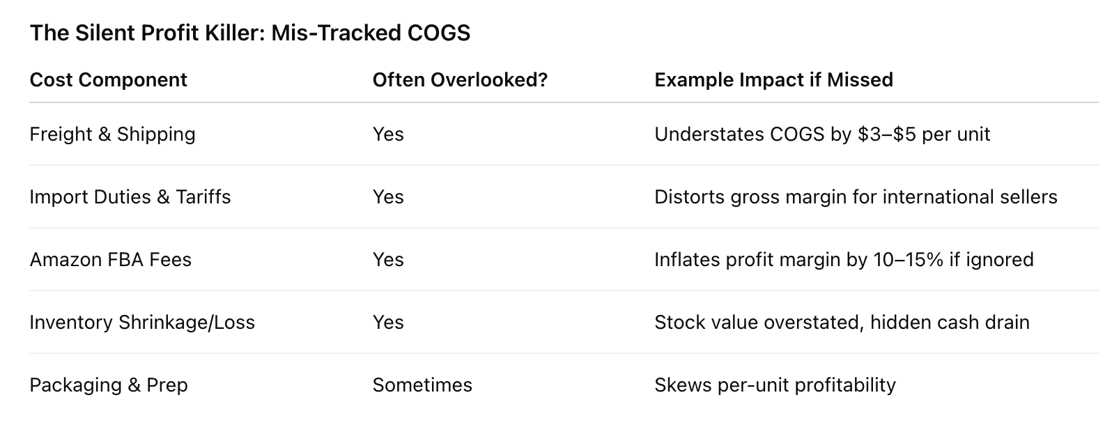 Most ecommerce operators underestimate the complexity of tracking Cost of Goods Sold (COGS). Failing to include freight costs, platform fees (from Shopify or Amazon), import duties, and even inventory shrinkage delivers a distorted gross margin. If you’re simply taking last month’s purchases and dividing by items sold, you’re missing variable costs like Amazon fulfillment fees or restocking losses.