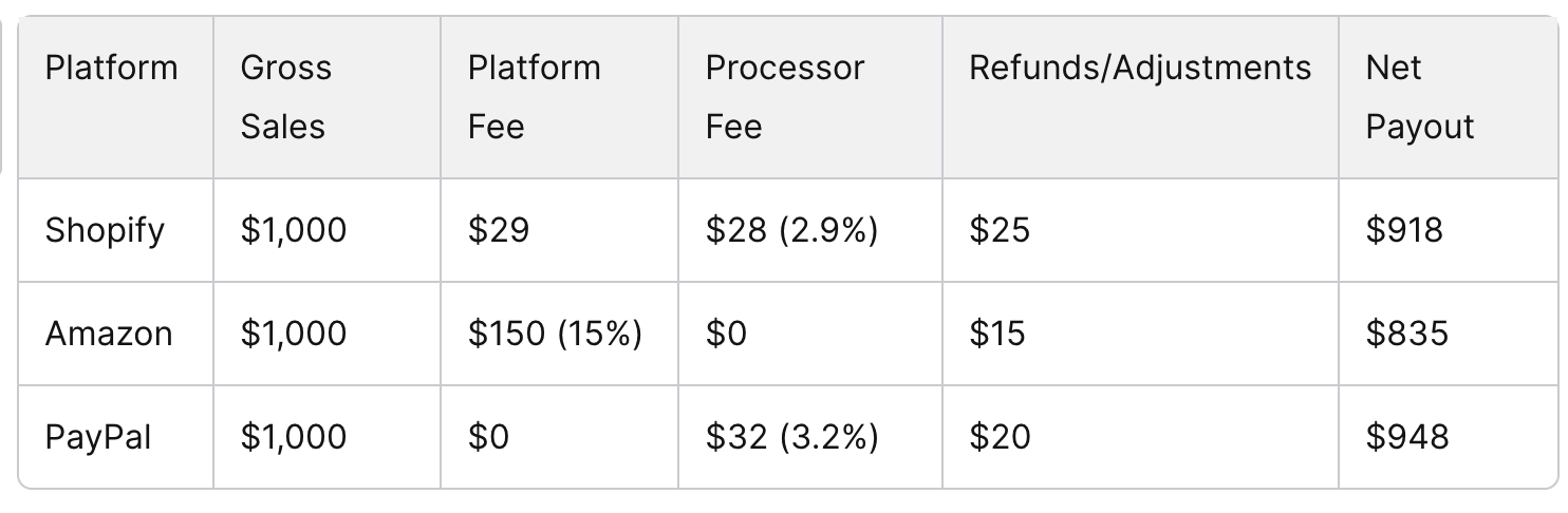 Fees are silent erosion on every payout. Shopify, Amazon, Stripe, and PayPal each layer on different transaction charges—often 2.5–3.5%—plus flat per-transaction fees and potential cross-border surcharges.