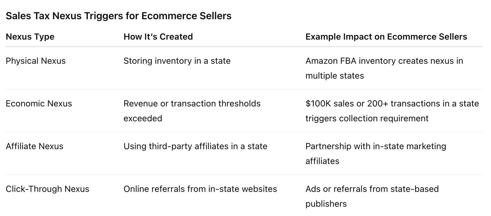 Ecommerce sellers must understand where they have nexus, which is the legal connection requiring them to collect and remit sales tax. Nexus can arise from physical presence, such as inventory stored in a warehouse, or from economic thresholds like revenue or transaction counts in a state.