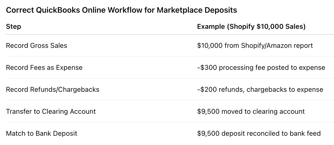 The correct workflow in QuickBooks Online uses a clearing account. Instead of booking the bank deposit directly as income, sellers should: