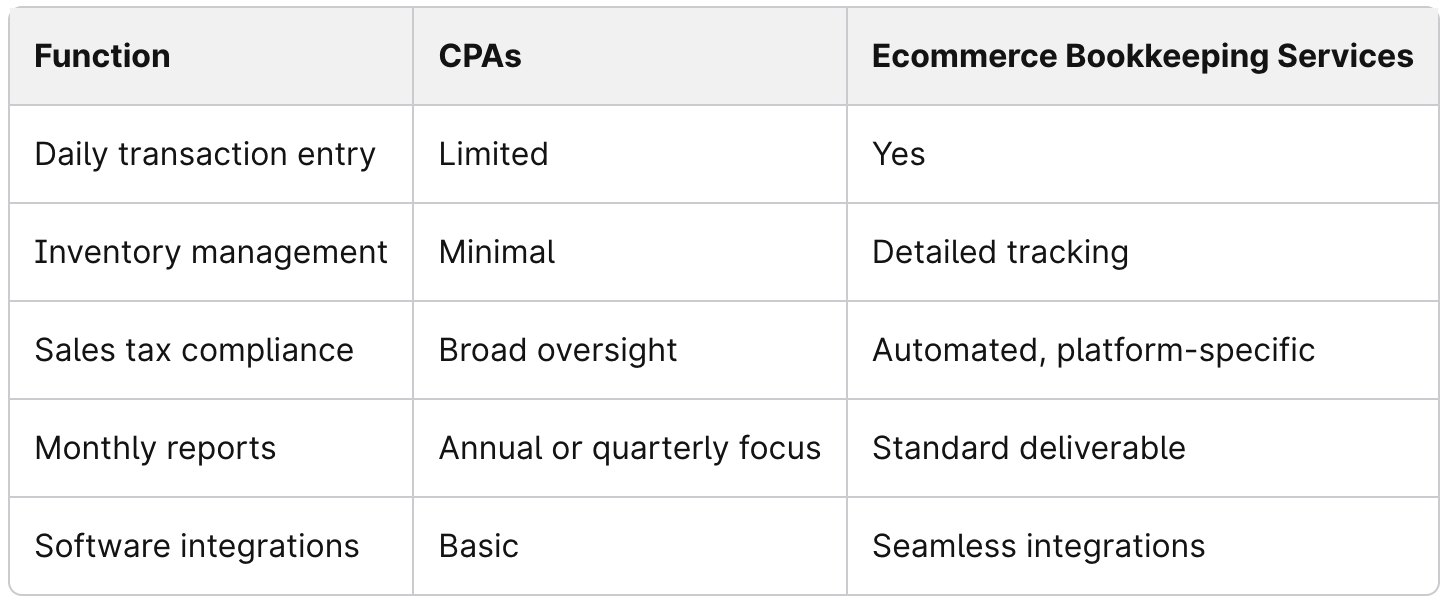 CPAs and ecommerce bookkeeping services both support financial management, but their focus is different. CPAs provide high-level tax and compliance expertise, while specialized bookkeeping services manage the daily flow of transactions, inventory, and platform integrations.