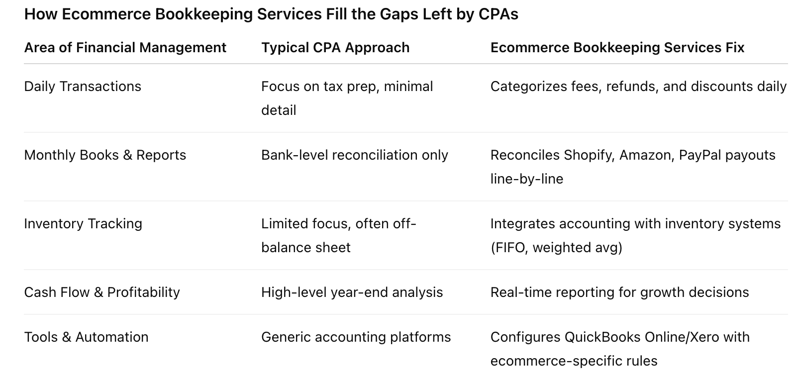 How Ecommerce Bookkeeping Services Close the Gap Left by CPAs